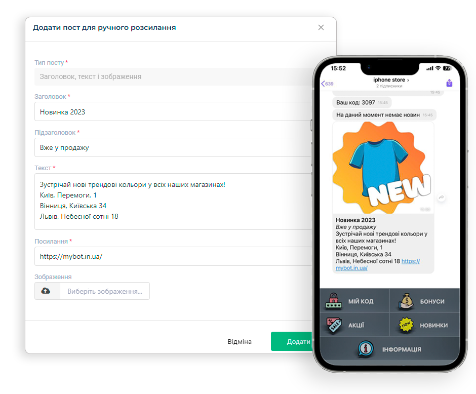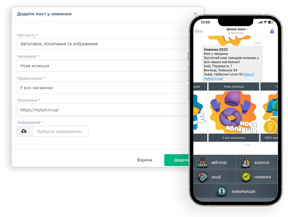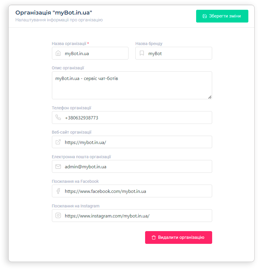 Назва, Номер телефону, email, сайт та Соцмережі відображатимуться у Чат-боті і будуть видимі для Ваших клієнтів.